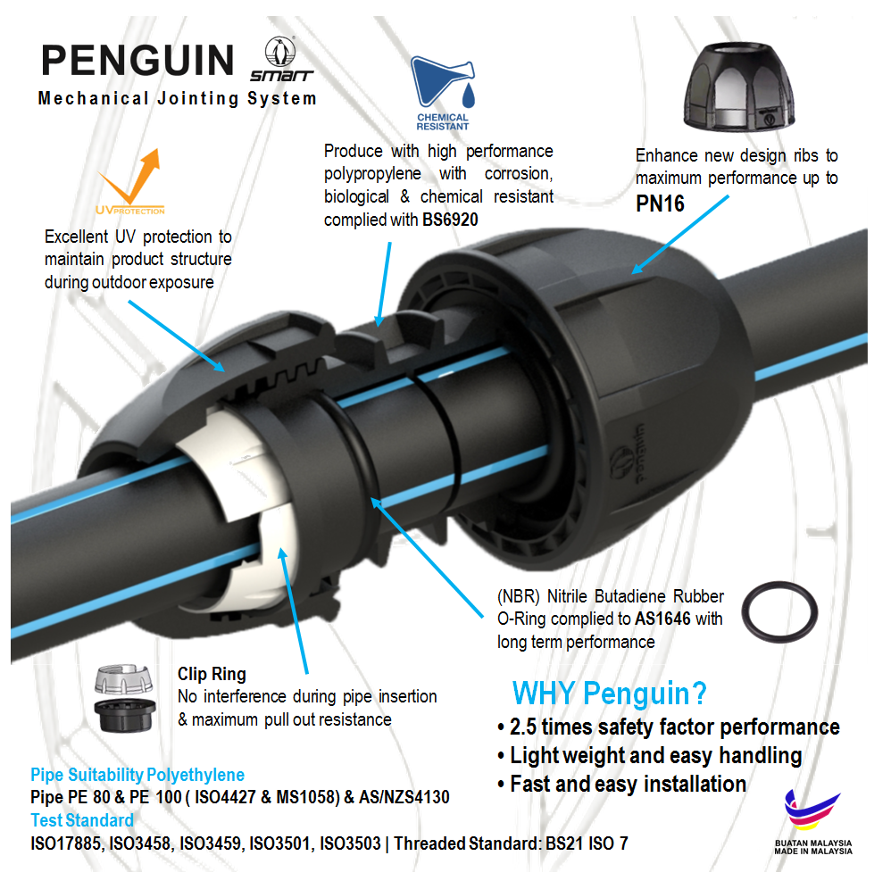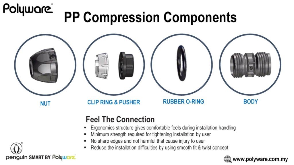 A reliable piping system requires compatible and durable fittings. PT Solusi Inti Bersama supplies fittings from well-known brands such as Polyware, Penguin, and Polyfuse.